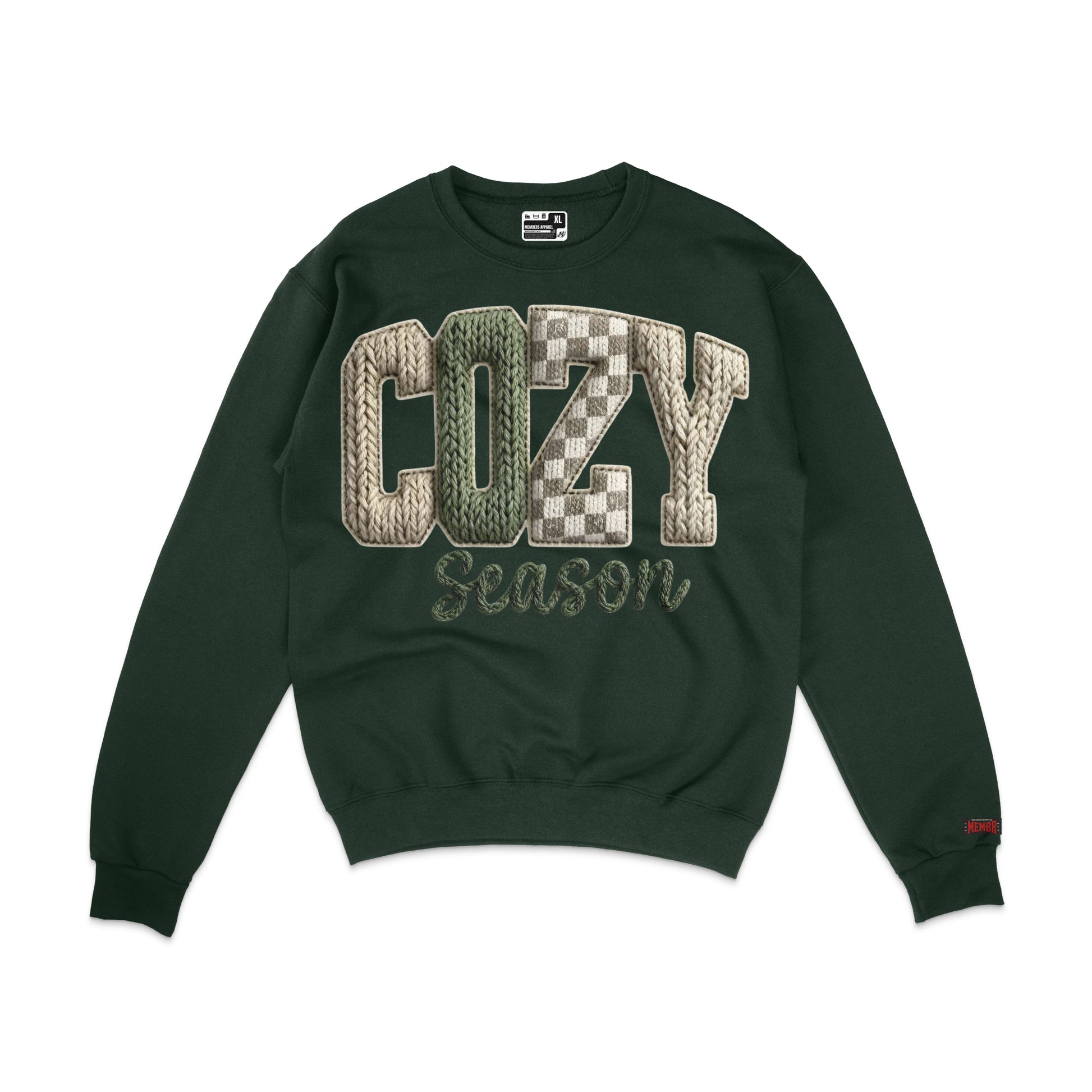 Stay warm and stylish in our “Cozy Season” Crewneck Sweater, featuring a high-detail Digital Direct Faux Knit Print. Designed with rich, textured lettering that looks like real yarn and patchwork, this sweatshirt brings the perfect seasonal vibe—without the bulk of embroidery. Available in deep forest green or crisp white, it’s soft, comfortable, and perfect for layering all winter long.
