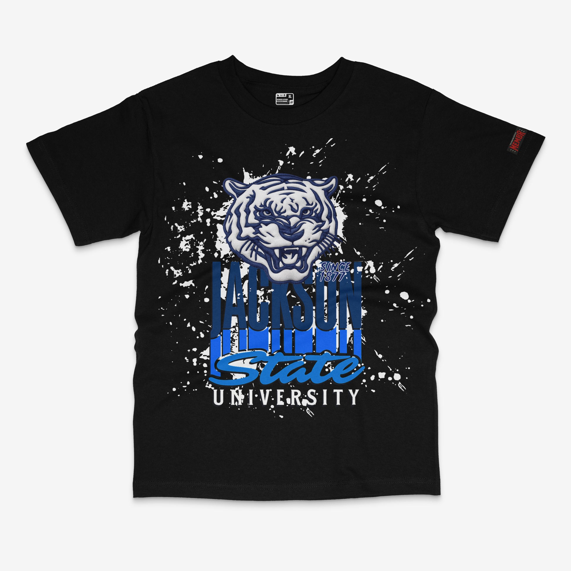 how your JSU pride in style with this bold Jackson State University graphic tee! Featuring a fierce tiger mascot, vibrant splatter-print background, and striking “Jackson State University” lettering, this shirt delivers unmistakable school spirit. Available in navy, red, and black, each tee offers a comfortable fit and durable print—perfect for game days, alumni events, or everyday wear. Represent the Tigers with confidence!