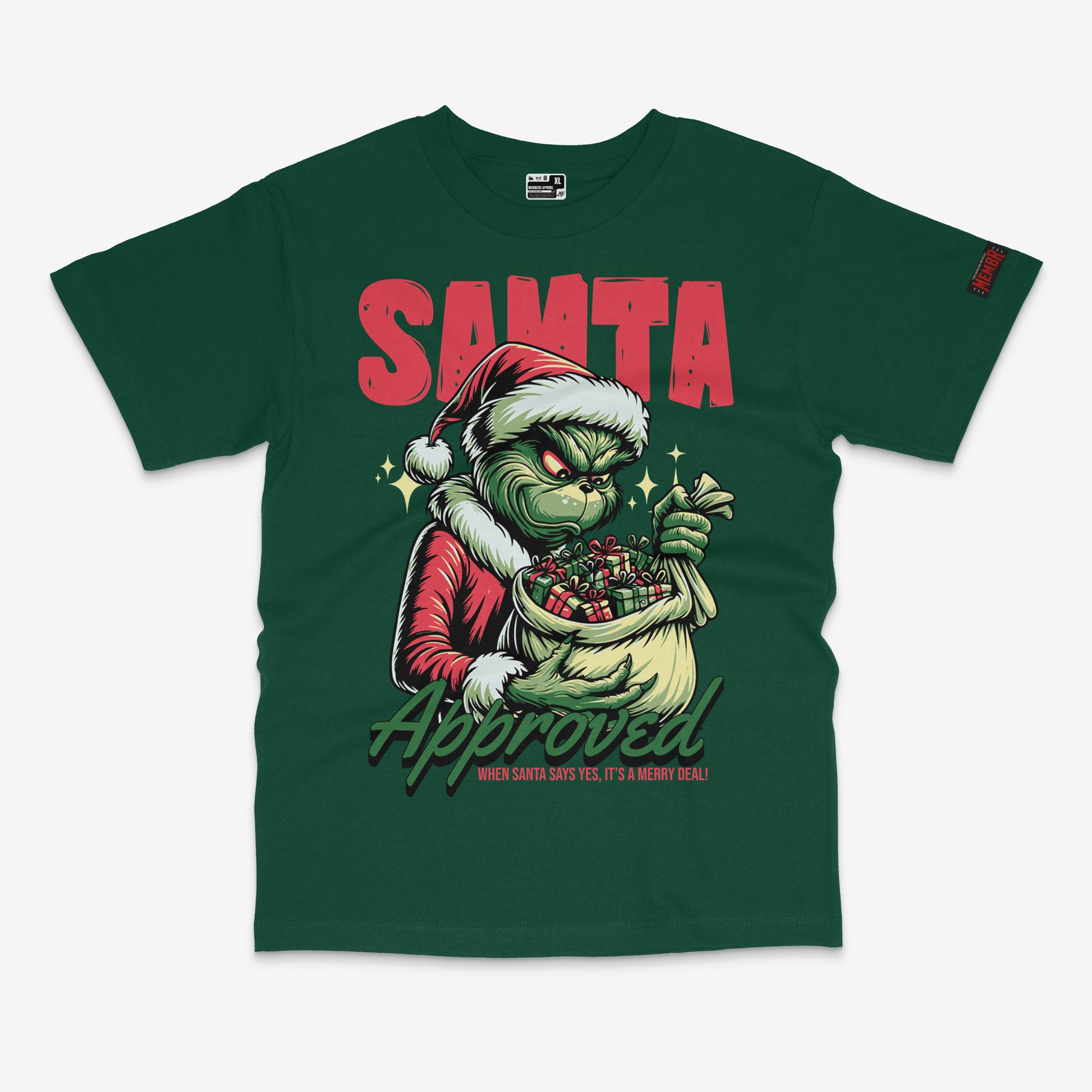 Add some mischievous cheer to your holiday wardrobe with our “Santa Approved” Tee! Featuring a grumpy green Santa clutching a sack of gifts, this shirt brings a playful twist to Christmas style. Bright, bold, and full of attitude—perfect for parties, gifting, or anyone who loves a little holiday humor.