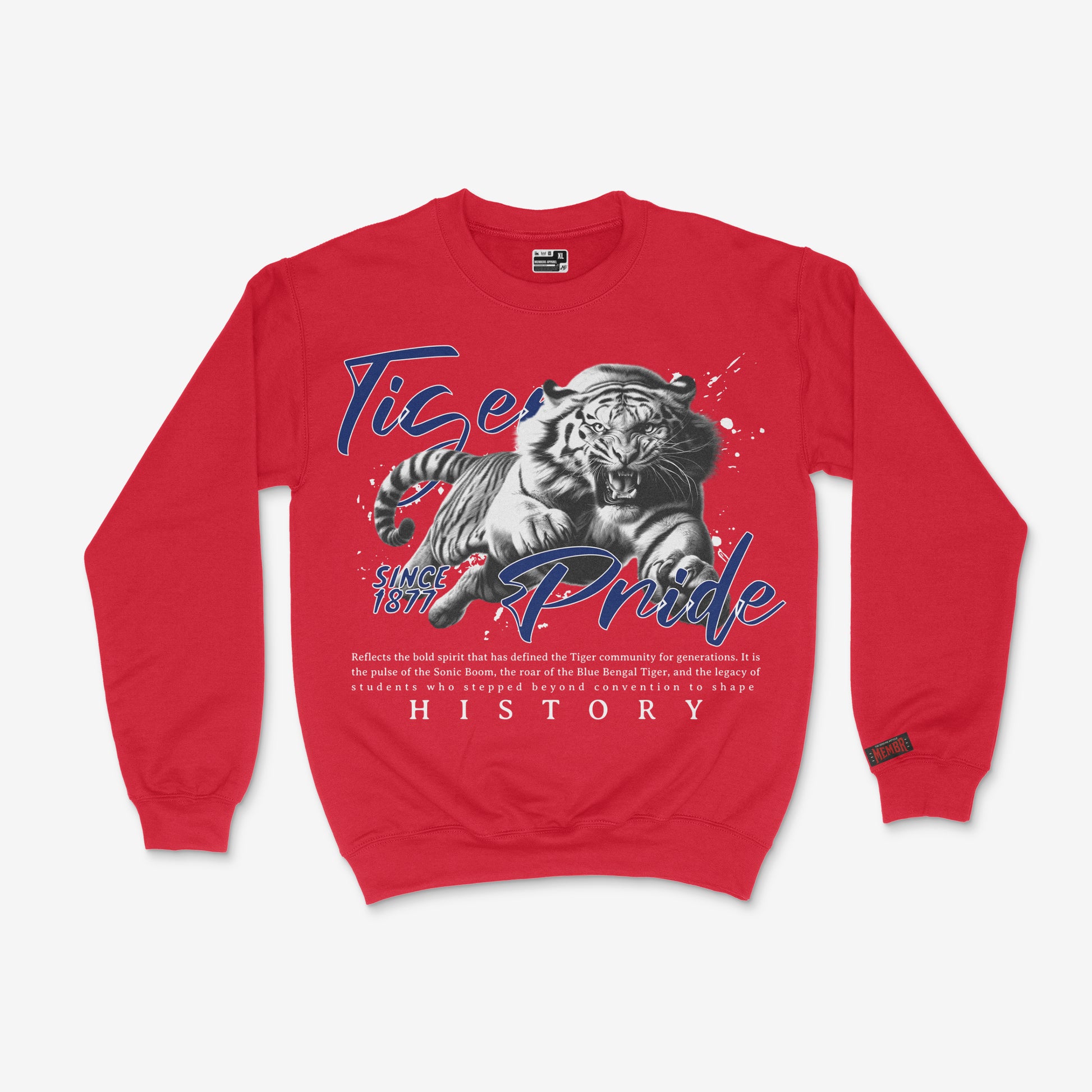 Show your Tiger Pride in style with this bold sweatshirt! Featuring a powerful charging tiger graphic, vibrant “Tiger Pride” lettering, and a tribute to legacy and history since 1877, this premium sweatshirt celebrates the spirit, strength, and tradition of the Tiger community. Available in red & navy, perfect for the SWAC Championship, campus events, or everyday wear.